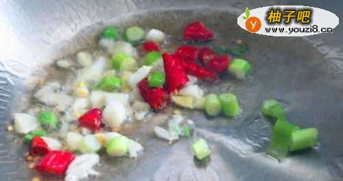 4锅中倒入油,依次倒入葱花、姜丝、蒜片和干红辣椒段爆香