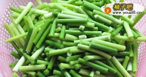 2将蒜苔掐掉尾部,冲洗干净,切成4厘米长的段,装入筐中备用