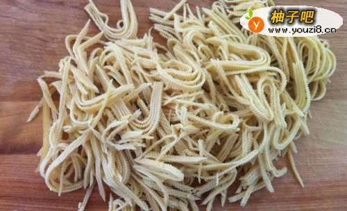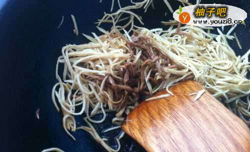 2干豆腐略微清洗干净,切丝,装碗备用。