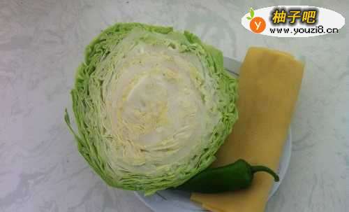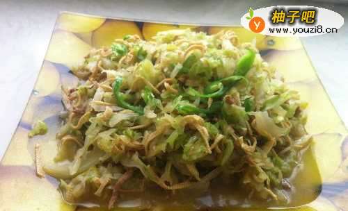 甘蓝切丝,放入淘米水中浸泡一下,再用清水清洗干净,装碗备用。