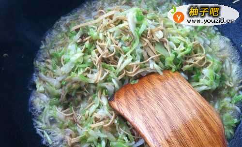 5将干豆腐放入锅中,翻炒均匀,加入甘蓝,翻炒均匀。