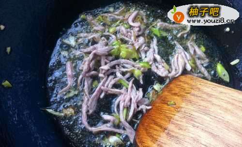 4热锅凉油,放入葱花爆香,再放入肉丝翻炒均匀,肉丝变色后,倒入少许酱油,翻炒。