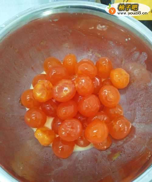 4第四步:将蛋黄上的剩余蛋清用清水冲洗一下,然后将适量的白酒倒入蛋黄上面腌10分钟左右,如下图所示。