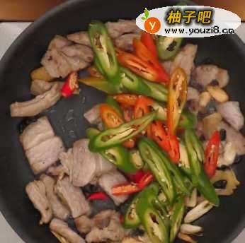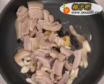 6放入煮熟的肉片用大火煸炒,炒至变色