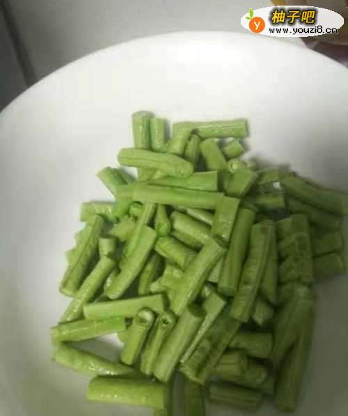 2豇豆去掉两端,洗净后切成小段,放入盘中备用。