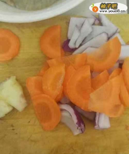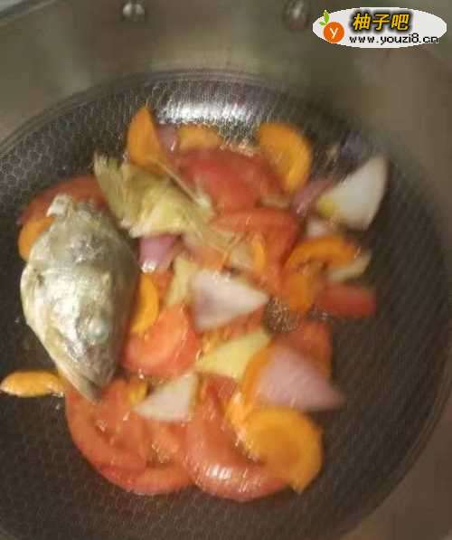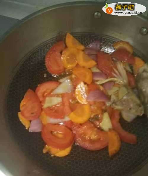 5锅中倒入少量汽率食用油,先将姜片爆香,然后将胡萝卜、洋葱、西红柿片倒入锅中翻炒。