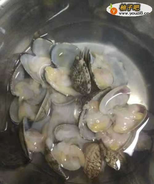 3花甲吐泥沙后,掰开洗净,放在清水中浸泡待用。