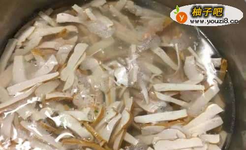 6煮一锅热水加一匙盐,将香干丝烫熟
