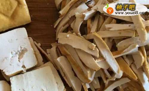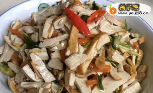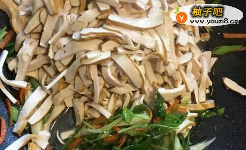 7最后将烫熟的香干丝拌入炒好的香料菜里,加一大匙酱油膏和少许鸡精拌匀即可