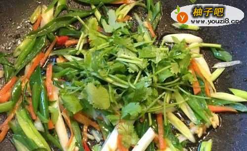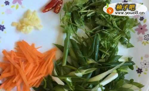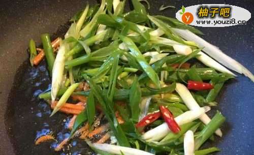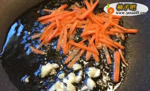 3小火油热、蒜末、红萝卜丝入锅炒香