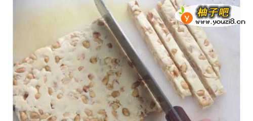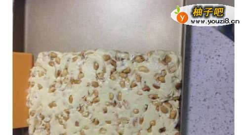 6加入花生,迅速搅匀。可以带一次性手套抹点黄油,然后像揉面团一样揉匀。倒入不粘烤盘,用刮板弄整齐。