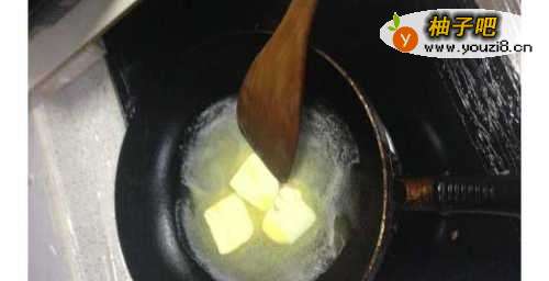 3用不粘锅,小火,放入80g无盐黄油,加热至融化。