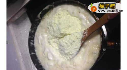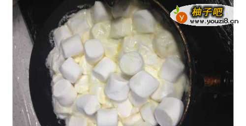 4继续小火,加入300g棉花糖,融化,搅匀。