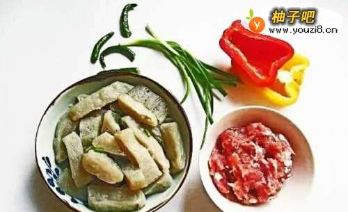 准备好所有食材,将粉切段、猪肉剁成泥。