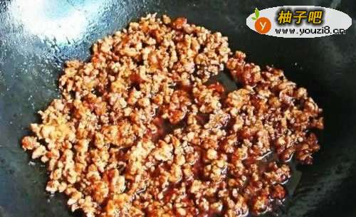 2将猪肉末加少许淀粉、酱油调拌均匀腌制5分钟。炒锅预热,倒入油,放入肉末翻炒2分钟,成散开的颗粒状即可盛出。