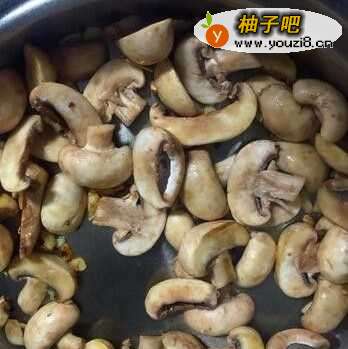3转中火,把蘑菇放进去翻炒两三分钟左右,可以看见蘑菇变色,逐渐变得油润。