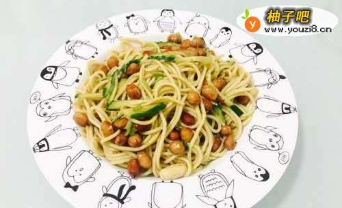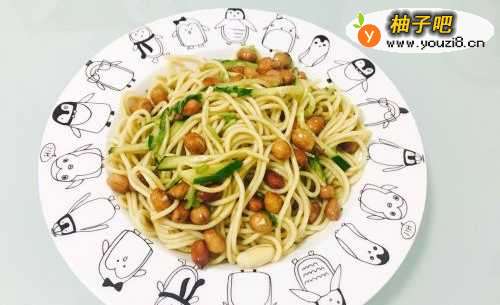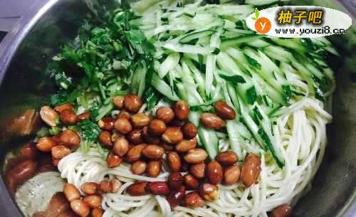 4紧接着将沥干水分的面条倒在大一点的盆或碗里面,加入适量花椒油,带上一次性手套让每一根面条都沾上油。记住花椒油千万不要倒多了,否则会很麻。紧接着把花生米炒熟。