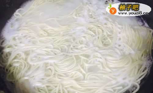 首先再锅里放入适量水,水烧开之后把面条放进去煮到断生,千万不要煮过头了!
