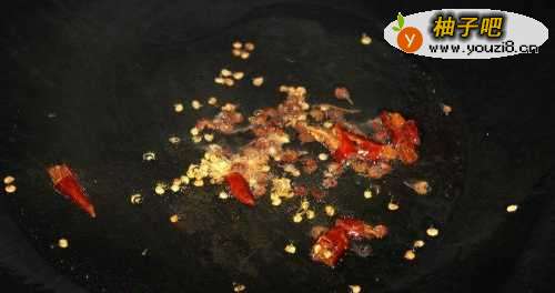 5锅中放油(凉油下锅),放入干辣椒和花椒炸香。