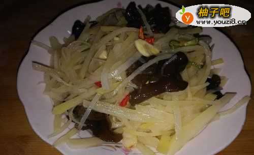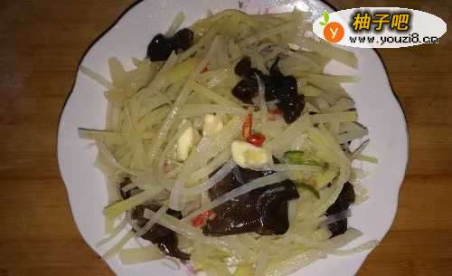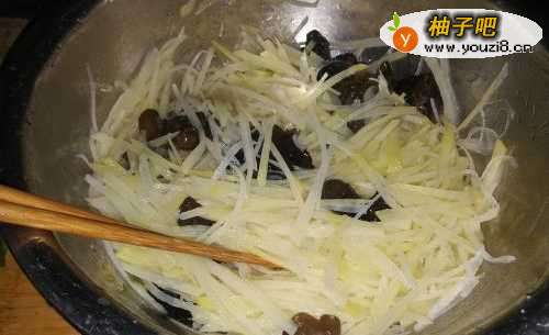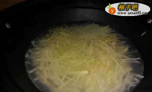 3水开倒入切好的土豆丝焯熟,木耳也可以一块用开水煮一下。土豆丝煮的时间不宜过长,水再次滚了之后土豆丝就可以捞出了。将煮熟的土豆丝捞至备好的凉水里泡几分钟,凉拌后的口感更好。