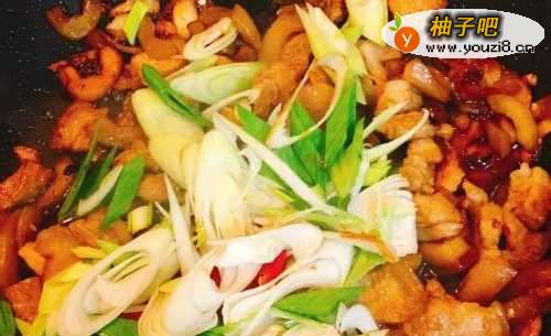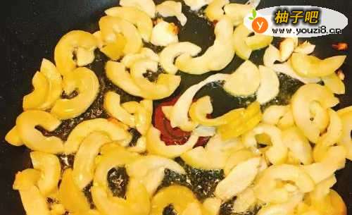 6调味完成后,转至小火将蒜苗、辣椒片下锅拌炒软化,就可以起锅了