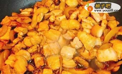 5肉片变色后,转至中火倒入少许米酒炝锅去腥味;及倒入两汤匙酱油膏、少许红糖拌炒至入味