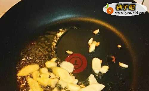 2火候调至中火,并将蒜末、嫩姜片;下油锅爆香