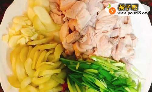 嫩姜切片、腌黄瓜洗净去籽切片、青蒜切片、大辣椒切片、蒜头拍末; 五花肉切片氽烫