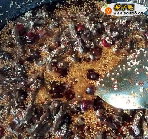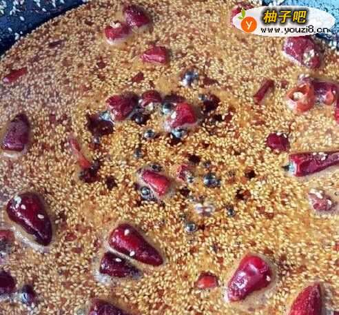 5炒料、油温不能太高小火放入干辣椒截、芝麻、香料、辣椒面炒2分钟。