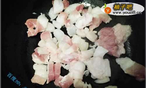 2打开电磁炉,先往锅内加入少量的油,将油烧热,晃动油锅,让油均匀沾染锅底,然后放入肉片,控制小火慢榨,榨出些猪油。