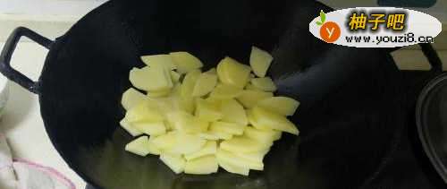 2将切好洗净的土豆片倒入锅中煸炒。