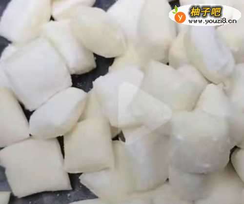 5然后切成长条,再切成小丁,再饧发10分钟。见下图