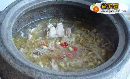 6加入枸杞炖煮3分钟,加入食盐,鸡精调味!这样炖煮出来的罩追裹豆芽鸡汤,鲜嫩味美!