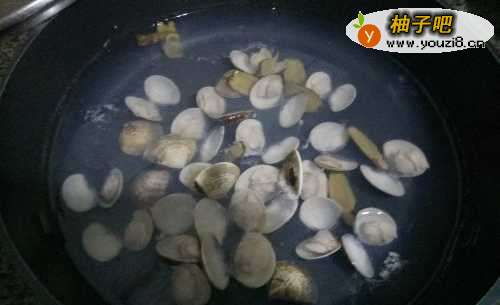 4将洗好的花蛤倒入锅里,一起煮;