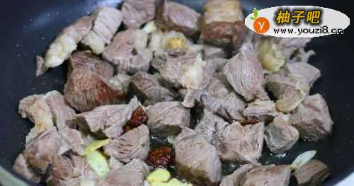 3西红柿洗净切块儿,葱姜改刀;热锅凉油,下八角和桂皮炸香,然后再放葱姜炒出香味儿,再放牛肉进去翻炒几分钟。