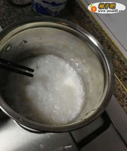 首先把已经煮好的白粥放入小锅中