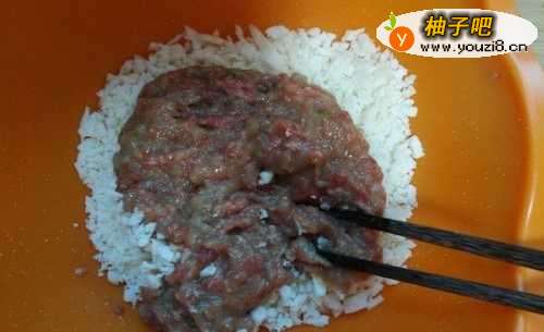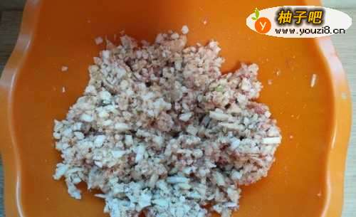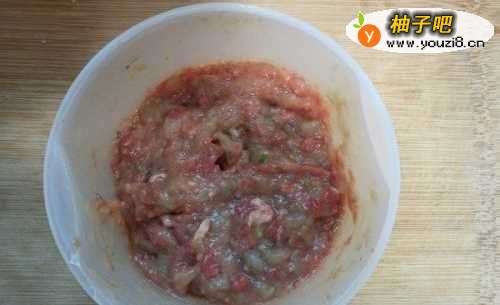 3将肉馅中放入少量盐、蚝油、香油、花椒粉,然后按一个方向搅匀;