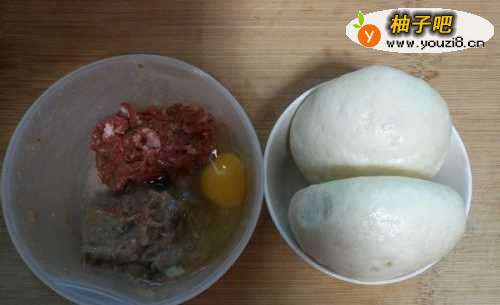 将牛肉和虾仁剁碎成泥状放入小盆中,然后将一个鸡蛋打入小盆中,馒头是前一天的剩馒头;