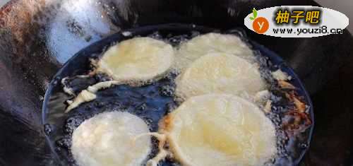 4热锅油,温火,七成油温下芋头片;炸至两面金黄。