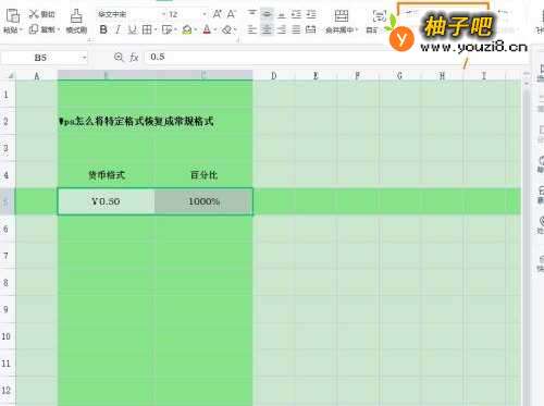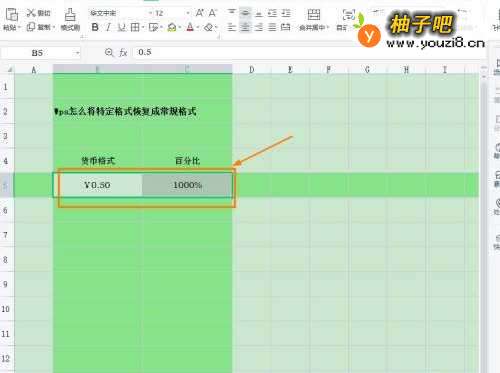 在Wps表格页面,选择要恢复格式的单元格【B5:C5】。