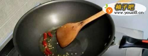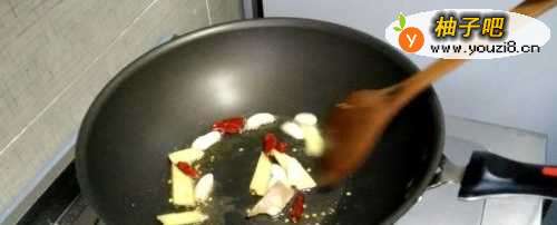 3红辣椒炸出香味以后,放入姜蒜,继续爆炒
