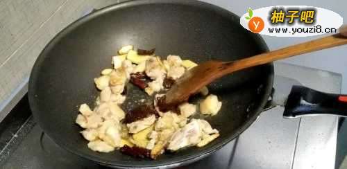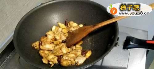 4放入腌好的鸡块,翻炒至鸡肉变色,然后加入豆瓣酱