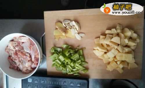 准备好食材,琵琶腿切块,土豆去皮切块,青椒切段,姜和蒜切片,红辣椒暂时不用切