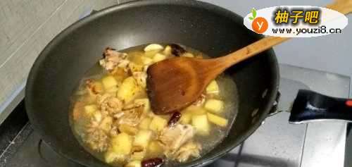 6加入水,没过鸡肉和土豆块三分之二,大火开煮,煮开之后小火继续煮