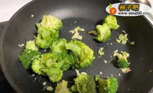 4中火爆香蒜末,倒入西兰花略炒