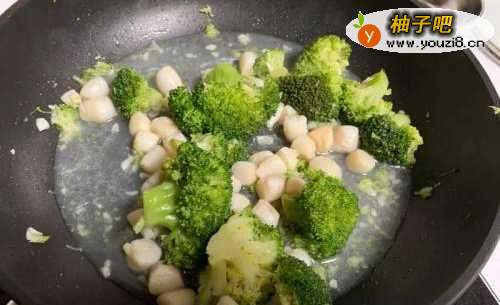5加入干贝、盐、胡椒粉,略炒后倒一点水,用中小火煮软西兰花