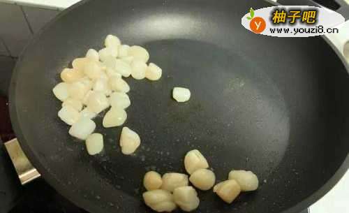 3煮西兰花的同时,先用中火炒一下干贝,炒至5分熟后捞起备用