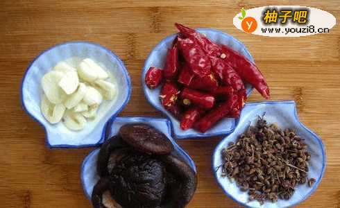 2大蒜切片、红辣椒切段、香菇泡发、花椒一把。