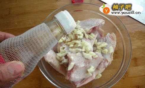 鸡翅撒入精盐、倒入少许香油、撒入蒜末腌渍2小时。
