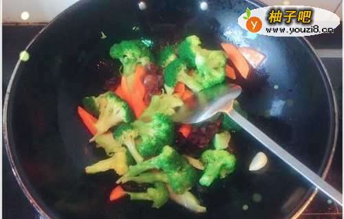 7最后加入适量的料酒、生抽和少许的醋,再加入适量的盐,翻炒入味后就可以出锅了。因为西兰花是焯过水的,所以很容易熟,不需要再翻炒很多的时间。而且加入的酱油和料酒也足够作为他们的汤汁了。